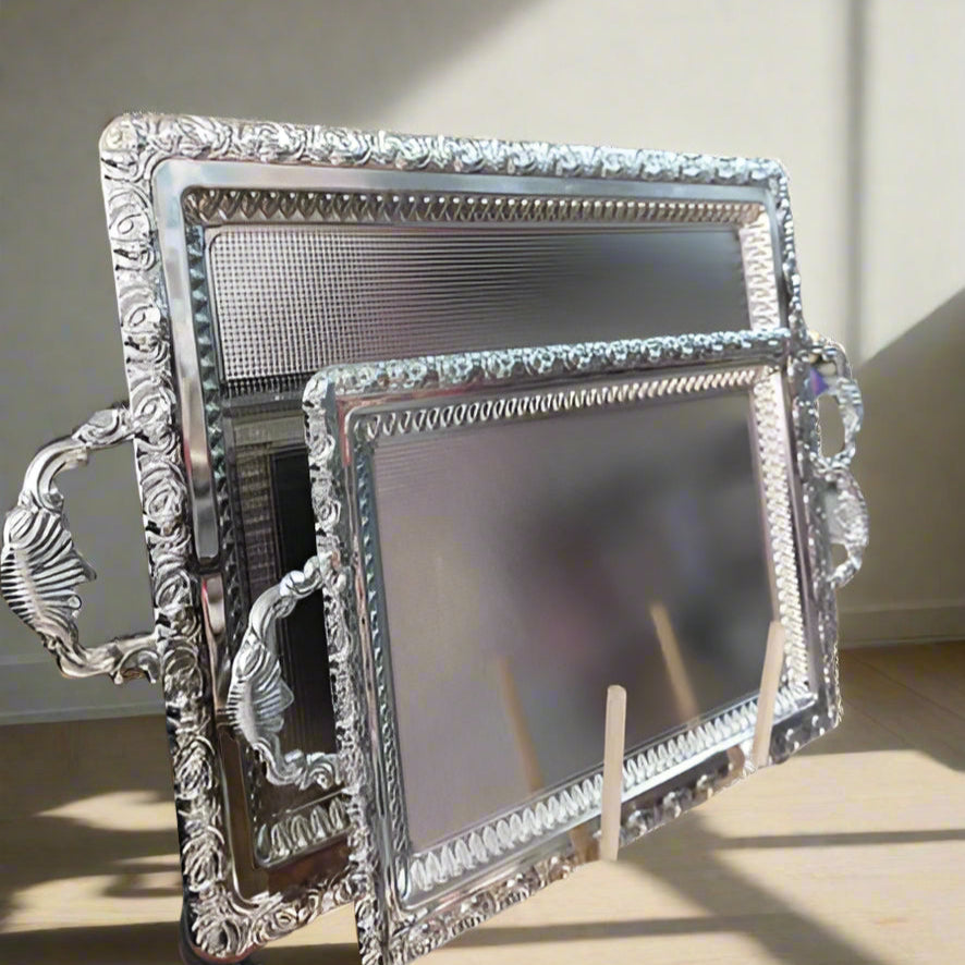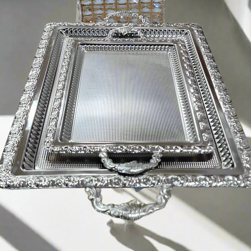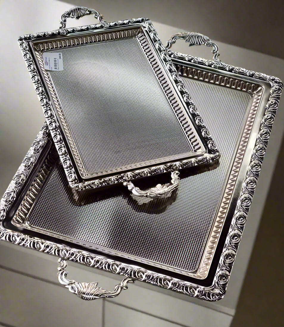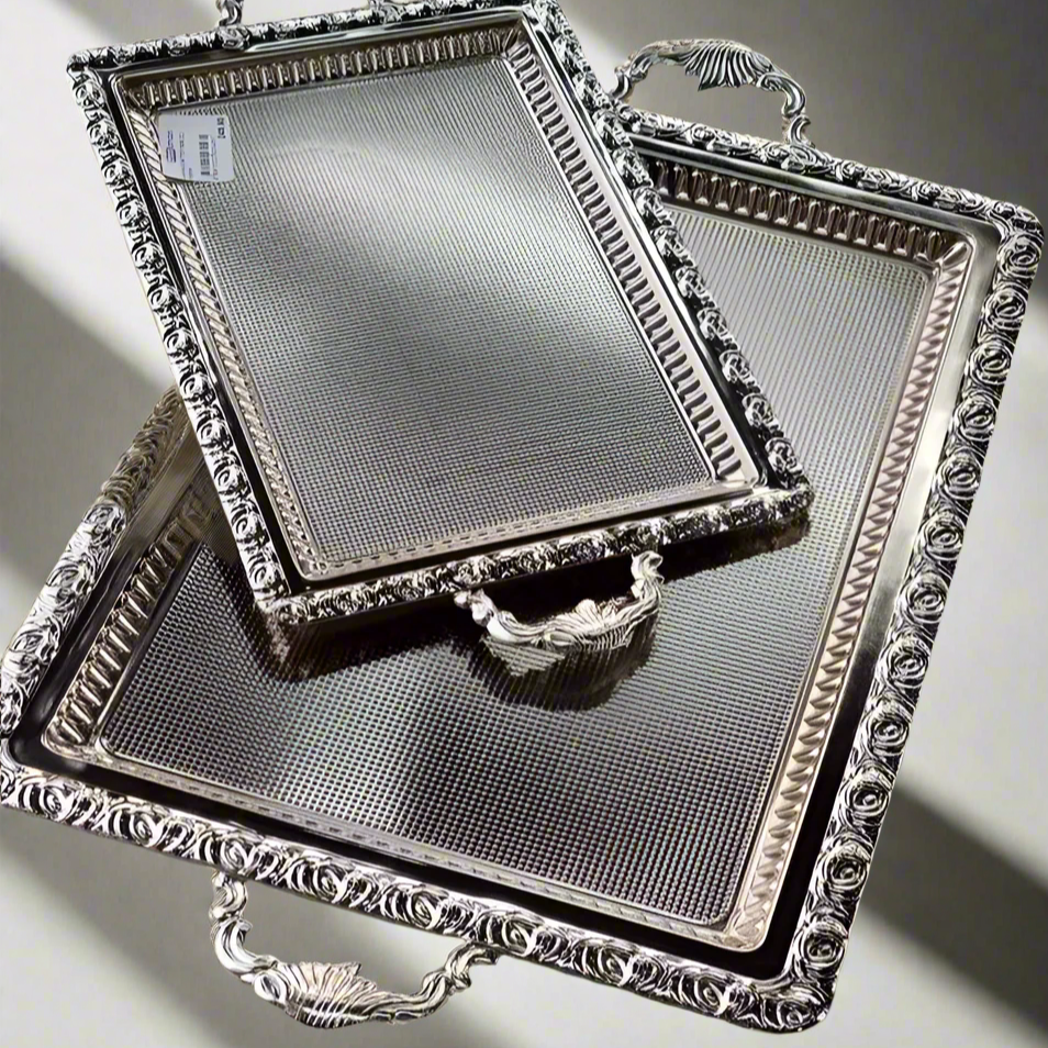 Sublimez vos moments de réception avec cet ensemble de plateaux en métal argenté, richement décorés de motifs floraux en relief. Idéal pour servir le thé, le café, les pâtisseries ou pour ajouter une touche royale à votre décoration de table. 👑