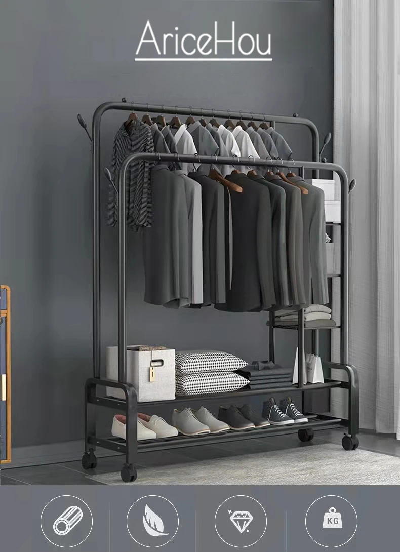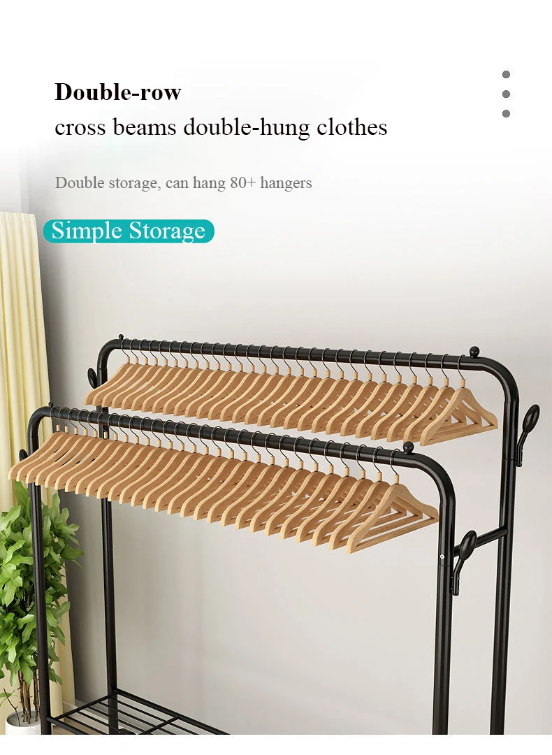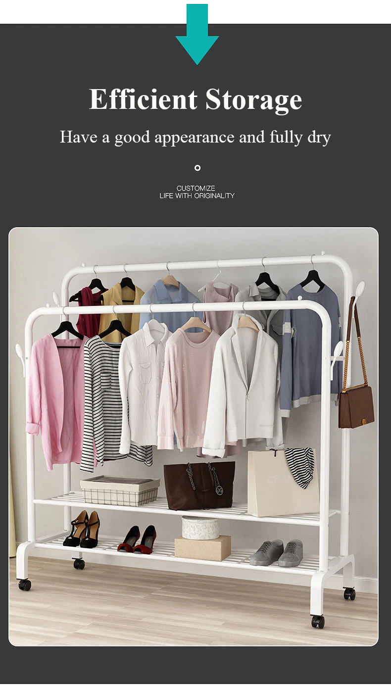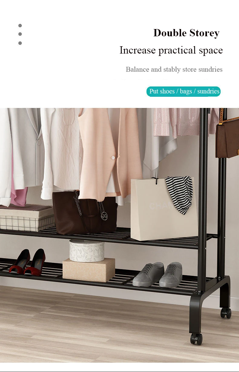 Le double portemanteau et organisateur français avec crochets en métal furovrugged, un double support vertical et 1 étagère en métal, un organisateur de vêtements et un support pour sacs et chaussures importés..le type est luxe, la taille est la dernière photo... en plus des roues et des crochets latéraux... et il est disponible en blanc et noir.Ses pièces sont toutes en métal, supportant jusqu'à 35 kg