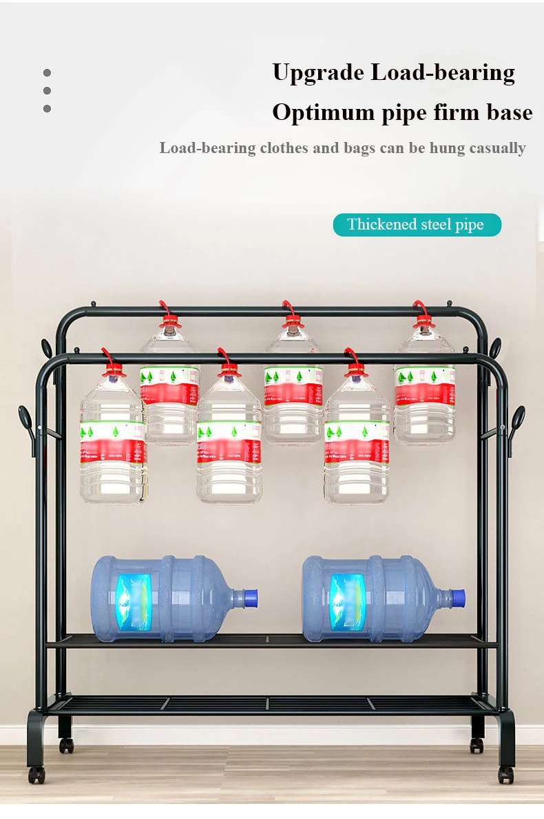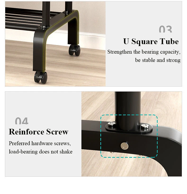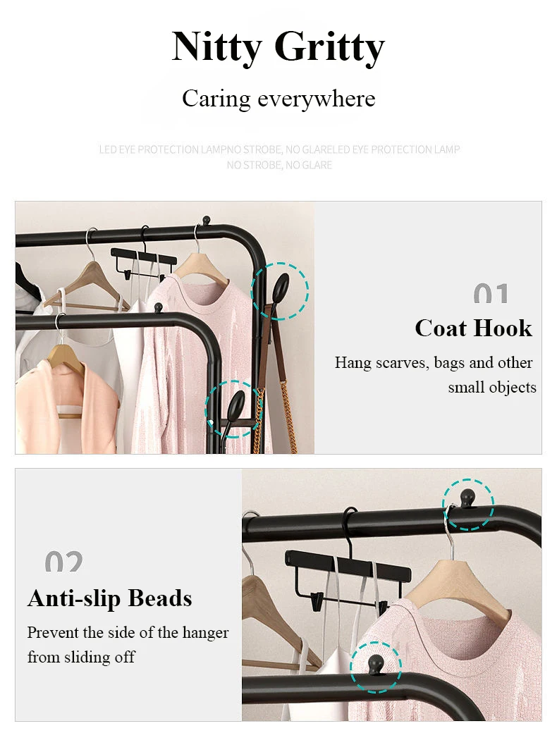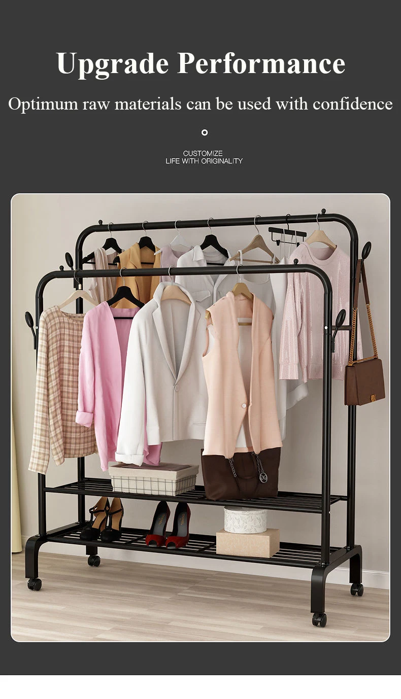 Le double portemanteau et organisateur français avec crochets en métal furovrugged, un double support vertical et 1 étagère en métal, un organisateur de vêtements et un support pour sacs et chaussures importés..le type est luxe, la taille est la dernière photo... en plus des roues et des crochets latéraux... et il est disponible en blanc et noir.Ses pièces sont toutes en métal, supportant jusqu'à 35 kg