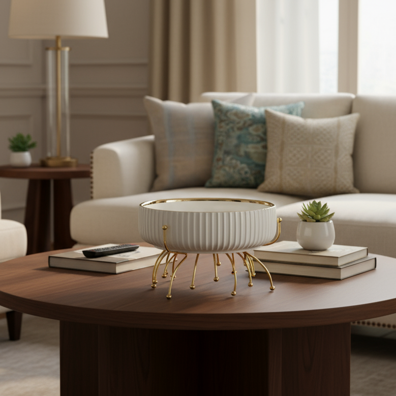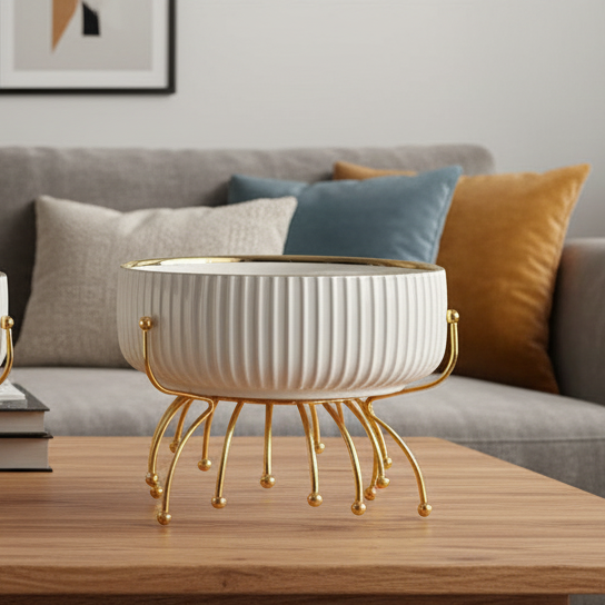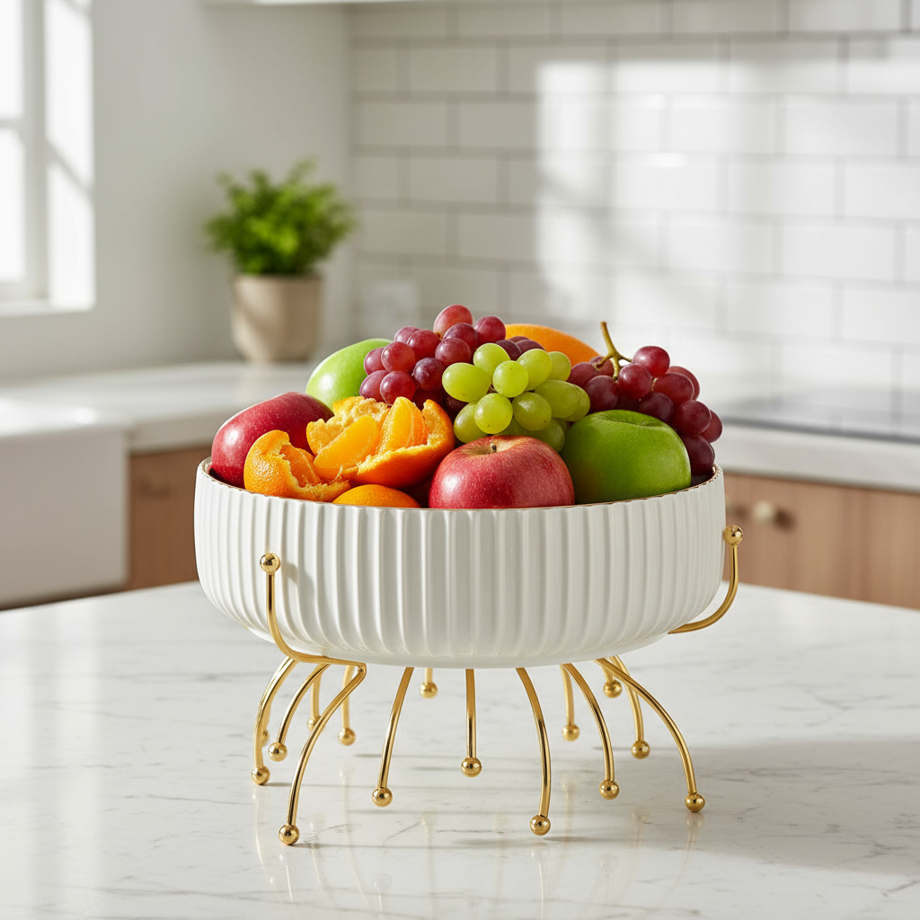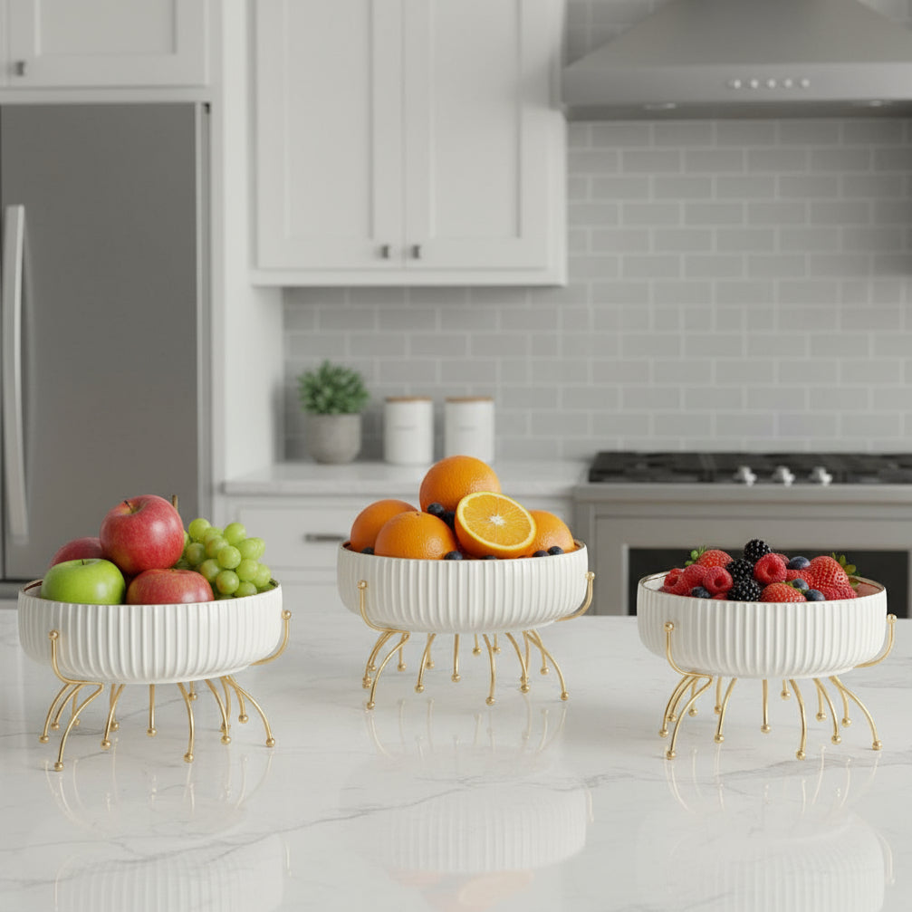 Conçus pour allier style et praticité, ces plats en céramique blanche au design côtelé s’accompagnent d’un support métallique doré brillant, ajoutant une note chic à vos repas .