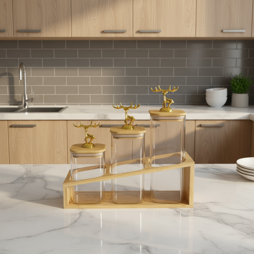 Sublimez votre espace avec cet ensemble de 3 pots en verre haut de gamme, ornés de magnifiques couvercles dorés en forme de cerf royal.
