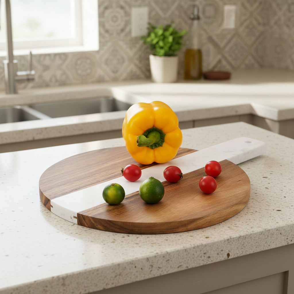 Découvrez l’alliance parfaite entre élégance naturelle et fonctionnalité premium avec cette magnifique planche à découper en bois d’acacia, sublimée par un incrusté en marbre patchwork.