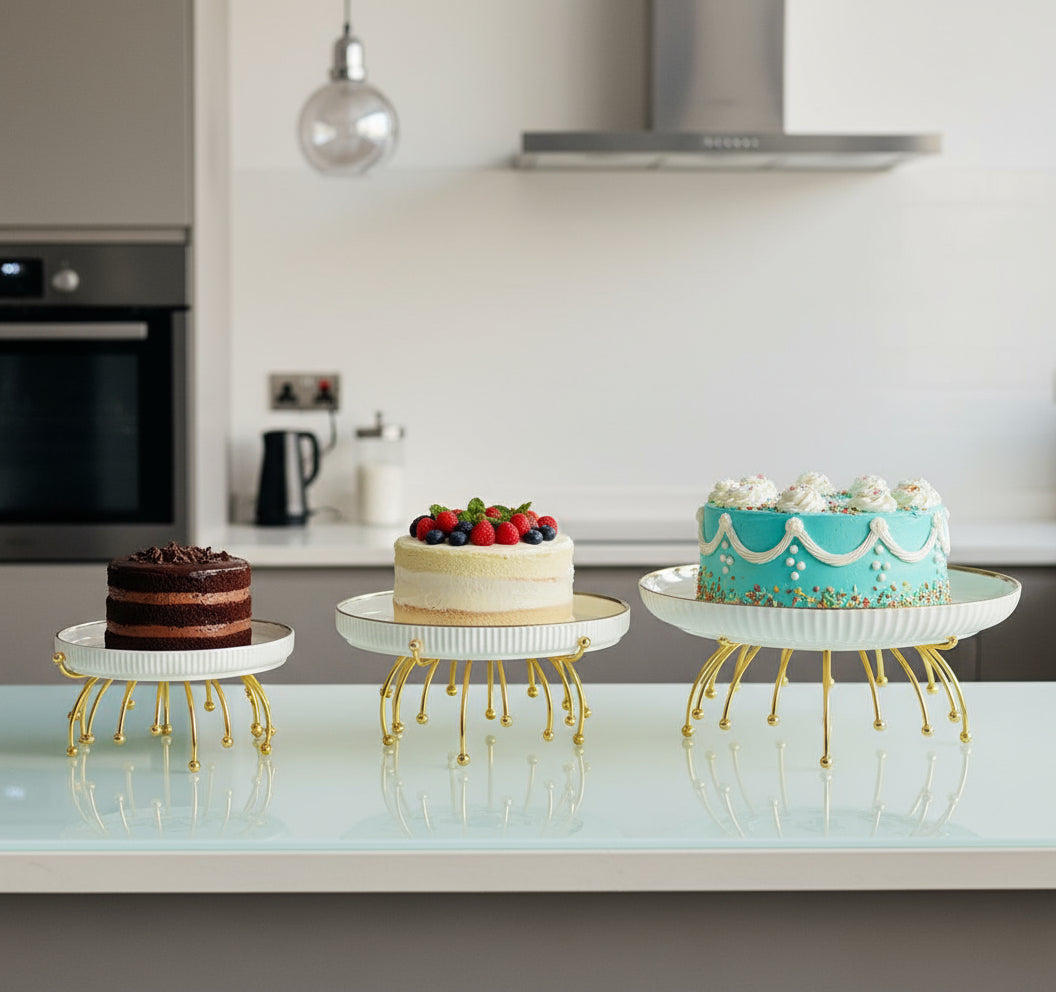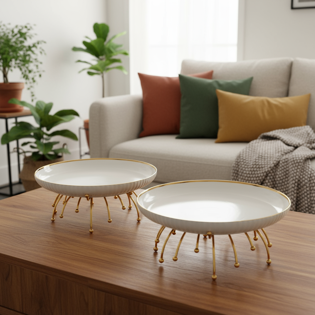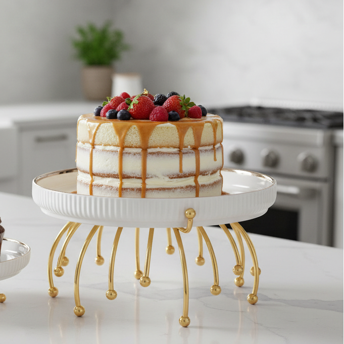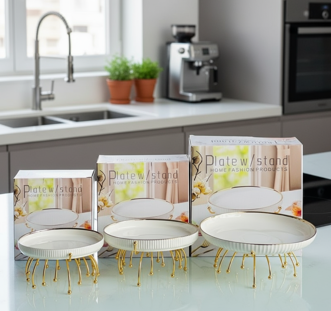 Conçus en céramique blanche côtelée avec un liseré doré raffiné, ces plateaux reposent sur un support métallique doré au design artistique et stable .