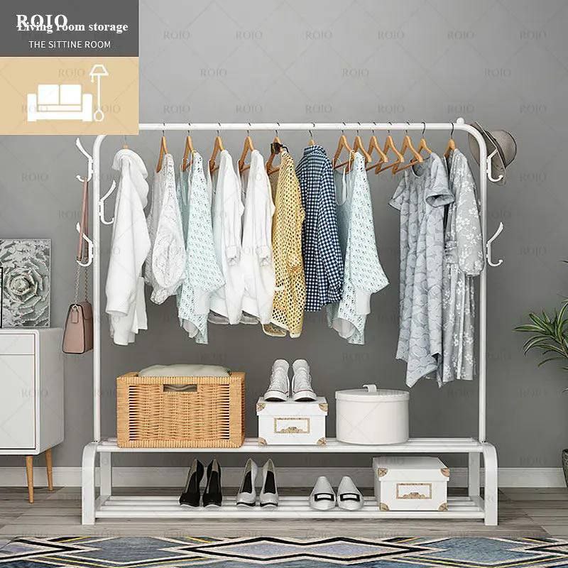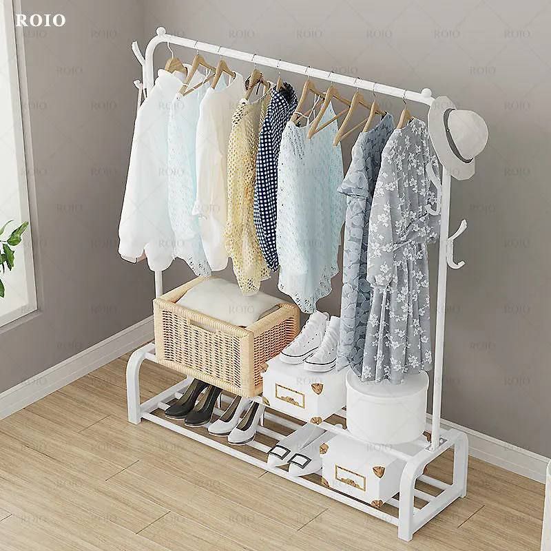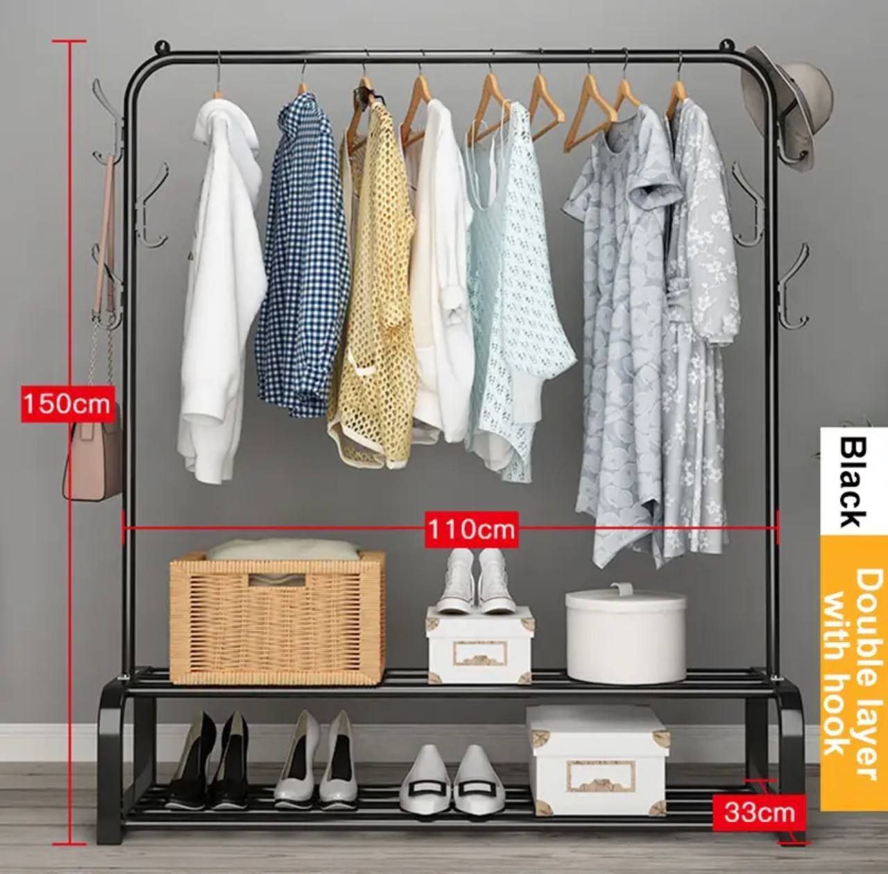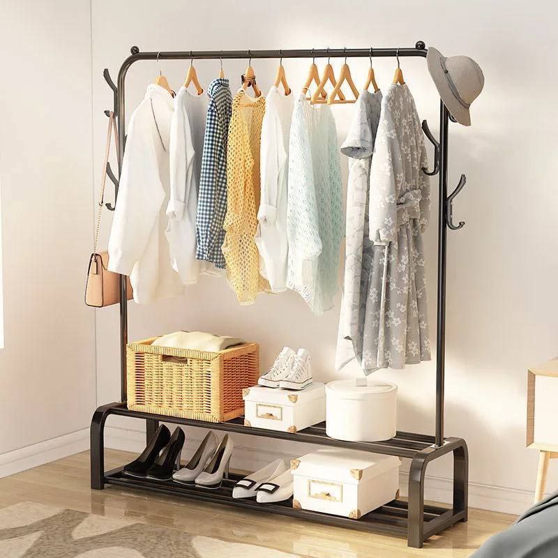1. Espace de Rangement Additionnel : Notre portant métallique offre une barre supérieure spacieuse pour suspendre vos vêtements, écharpes et manteaux. L'étagère inférieure avec crochets est idéale pour ranger vos chaussures, sacs à main et autres accessoires.